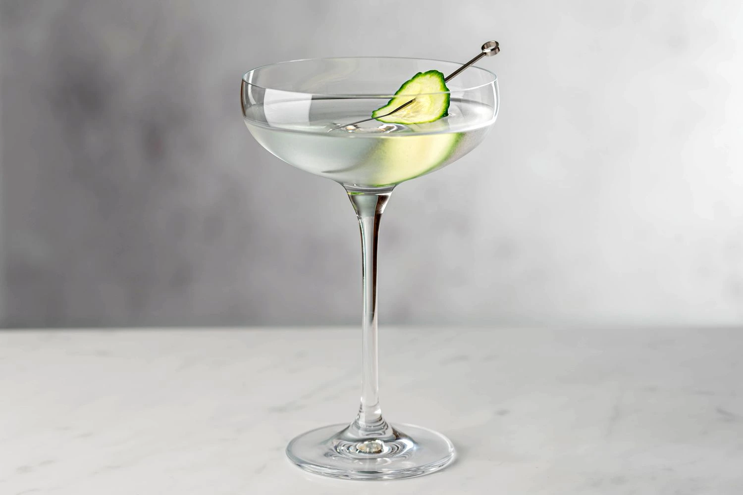 Gin or vodka, dry vermouth, olive brine, olive garnish.